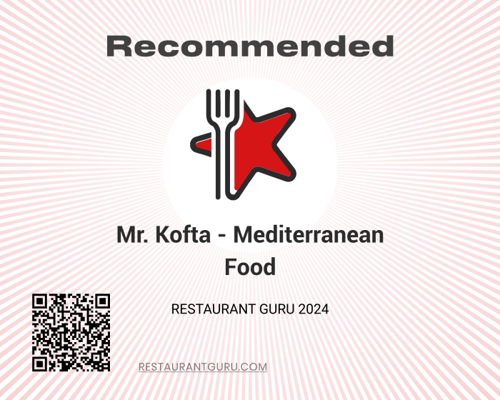 We are pleased to inform that Mr. Kofta - Mediterranean Food has been awarded a 2024 Recommendation badge by Restaurant Guru. Congratulations on your achievement! |