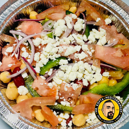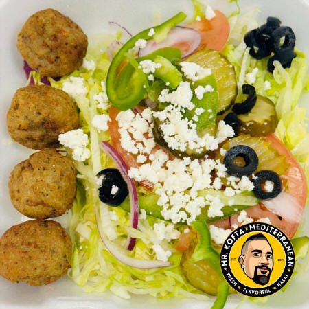 with sliced pita bread, fresh salad and our signature sauces drizzled on top.
