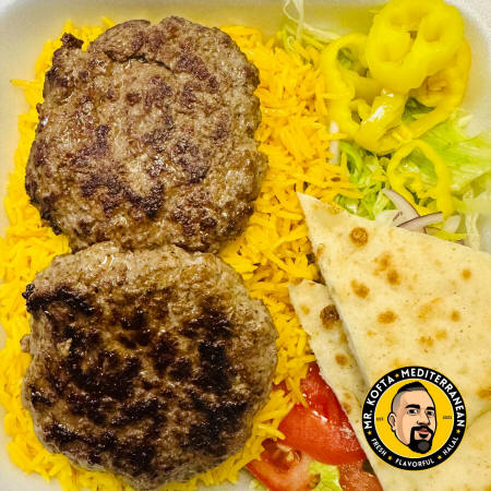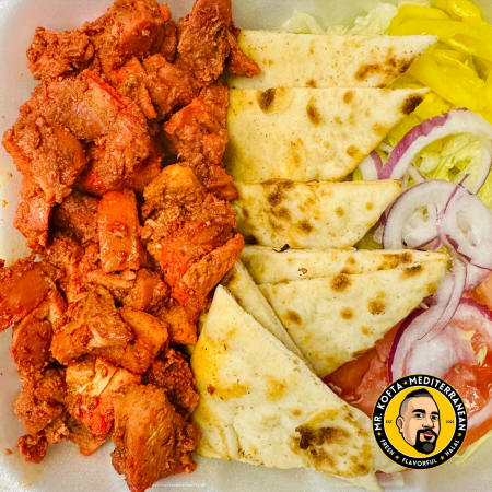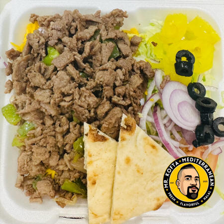thin cut Lamb slices cooked on flat top grill with diced Tomato's, red onion, lettuce & our signature sauce